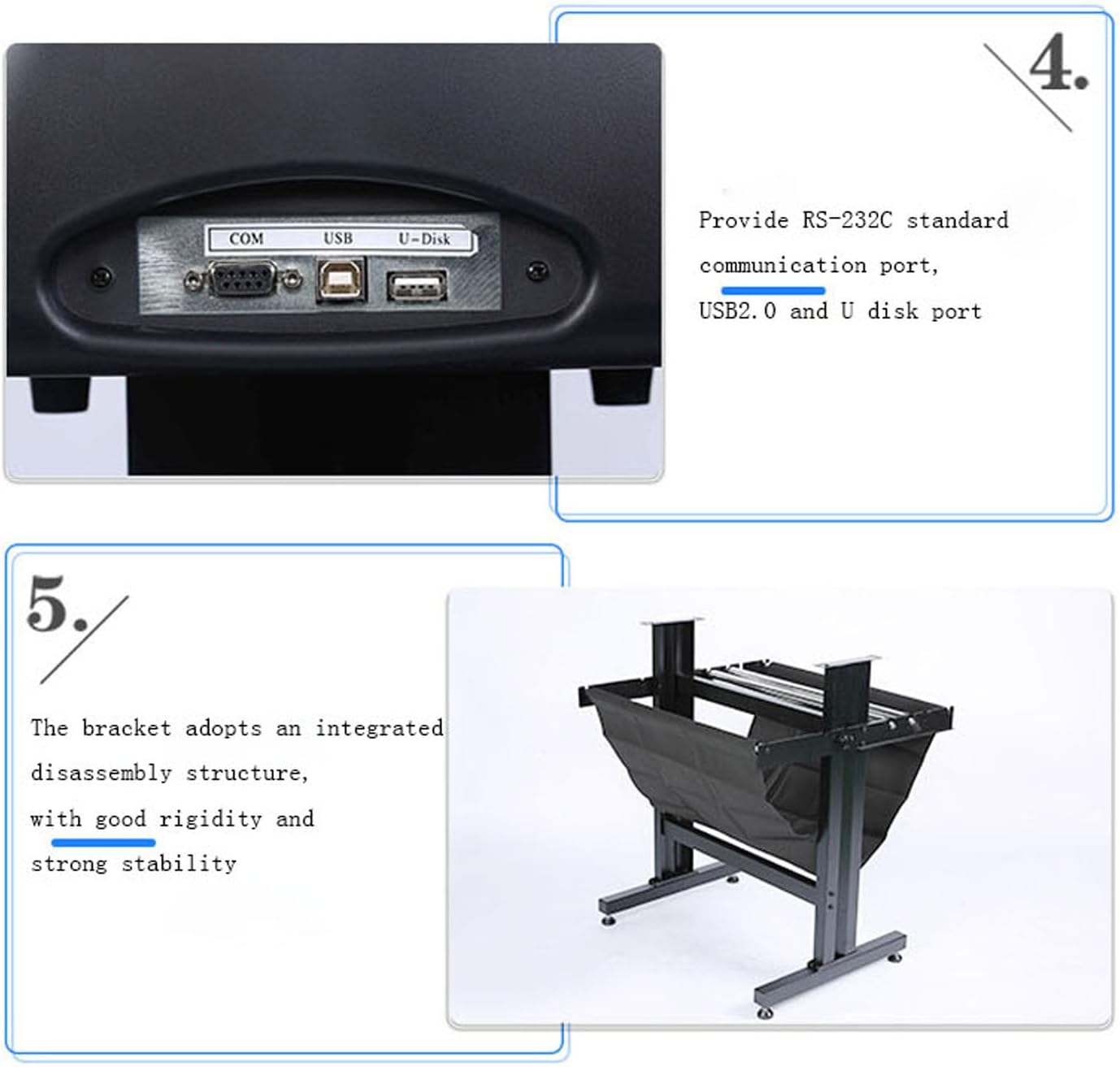 Parameters Model Item GC-721ABJ Max. Paper Width 720mm Max. Plotting Width 630mm Main board Stepping ARMS main board Max.cutting speed 5-800mm/s Max.Cutting Force 5-500g Roller Steel-string roller Interface COM+USB+U Disk Display Yes Work voltage AC85V~AC264V Command set DMPL/HPGL Colors BlackAnycut Software 1.We supply technique support after your purchasing. And we provide a detaileduser manual with words, pictures and video made by ourselves, after yourordering, we will send it out with the cutter machine 2.It can extract contours with one key, automatically generate marker points, and can also do segment cutting for long images 3.You can import pictures in JPG, TIFF, PDF, AI and other formats, and the software can extract them with one click, no need to make vector graphics Item Number: 004004