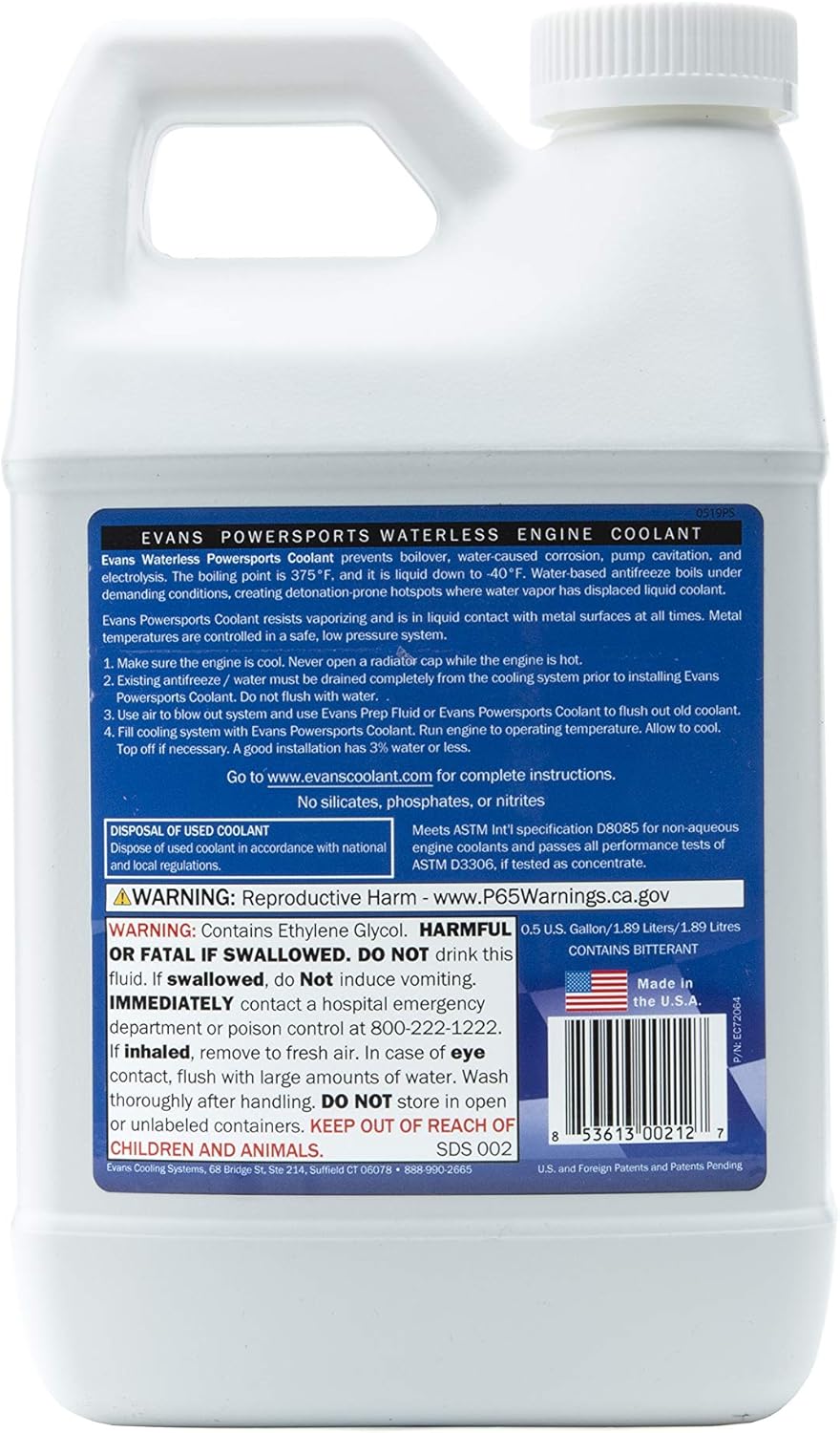 Evans Prep Fluid (EC42001) is a waterless cooling system flush engineered specifically to purge the cooling system of water and water-based antifreeze after draining and before installing new Evans Waterless Coolant. Prep Fluid should be used when block drains are unavailable or cannot be removed. It is not a substitute for thoroughly draining the cooling system and related components. Prep Fluid is not intended to be a stand-alone operating coolant, but as a flush only.Evans Collectors Choice Waterless Engine Coolant (EC31001) is specifically designed for vintage and classic gasoline vehicles, and light to medium duty diesel engines. Evans coolant eliminates many problems associated with water in conventional water-based cooling systems, while preserving the engine for a lifetime.Evans Powersports Waterless Engine Coolant (EC72064 Half Gallon) is formulated specifically for Powersports machines and the extreme conditions they encounter. Evans Powersports Coolant defends against heat-related damage, while allowing the engine to continue producing its peak horsepower. When converting an engine from a water-based coolant to Evans coolant, great care should be given during the installation (conversion) process to ensure that all of the old water-based coolant is removed. It is recommended that the system be flushed with Evans Prep Fluid prior to installing Evans Powersports coolant. When the installation is complete, the water content of the coolant should be no more than 3 percent. If the water is above that limit, the coolant will perform no better than water-based antifreeze.