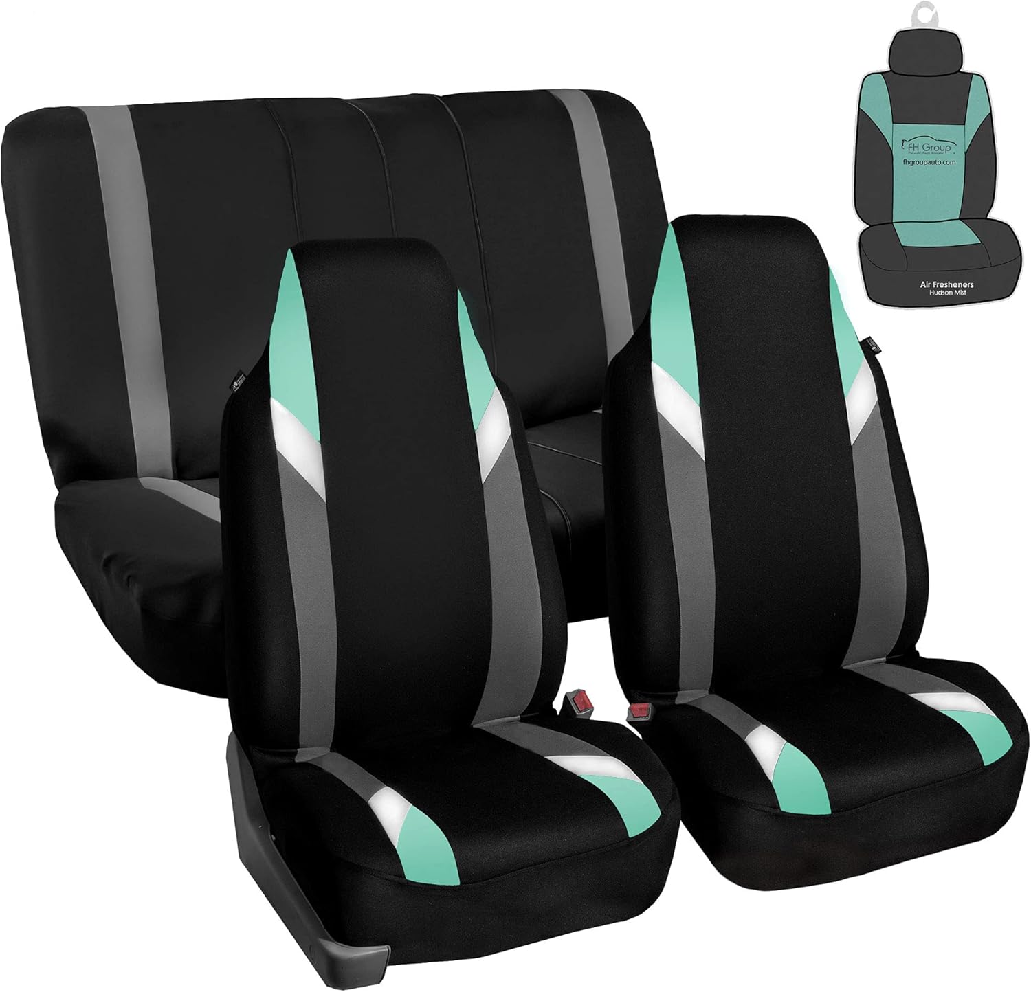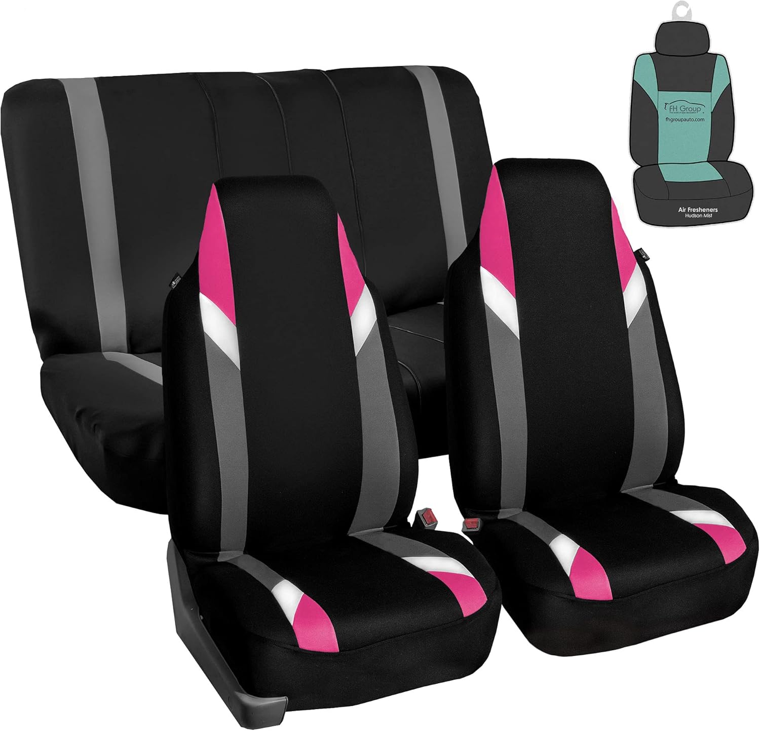 FH Group got you covered! Our full set of premium cloth car seat covers not only provide the best protection for your car's upholstery against any type of mess but they also enhance the looks of your car's interior. No need to worry anymore about spills, stains, mud, or anything damaging your original car seats because this car seat protector got your back. This full set of car seat covers includes two front 1-piece bucket seat covers, which are compatible with most sedans, SUVs, and vansβ bucket seats thanks to the universal high back seat cover design. This 1-piece design delivers the snug fit you're looking for, no matter if the front seatsβ headrest is removable or not. Our rear seat covers are fully compatible with 50/50, 40/60, or 60/40 split rear benches or longer benches. The cover features 3 zippers in the backrest AND bottom, and extra mesh pieces so you can move the rear seat freely or use the middle arm rests and get full protection.We understand messes happen, thatβs why these waterproof and washable seat covers for cars are convenient for any type of driver. We offer automotive seat covers in numerous fabrics, colors, and designs, so you can easily find the seat cover for cars that fits your style the most. We have car seat covers for women, for men and for everyoneFH Group car seat covers are a great car interior accessory for your vehicle. We have it all: car seat covers for SUV, car seat covers for autos, car seat covers for vans, you name it!