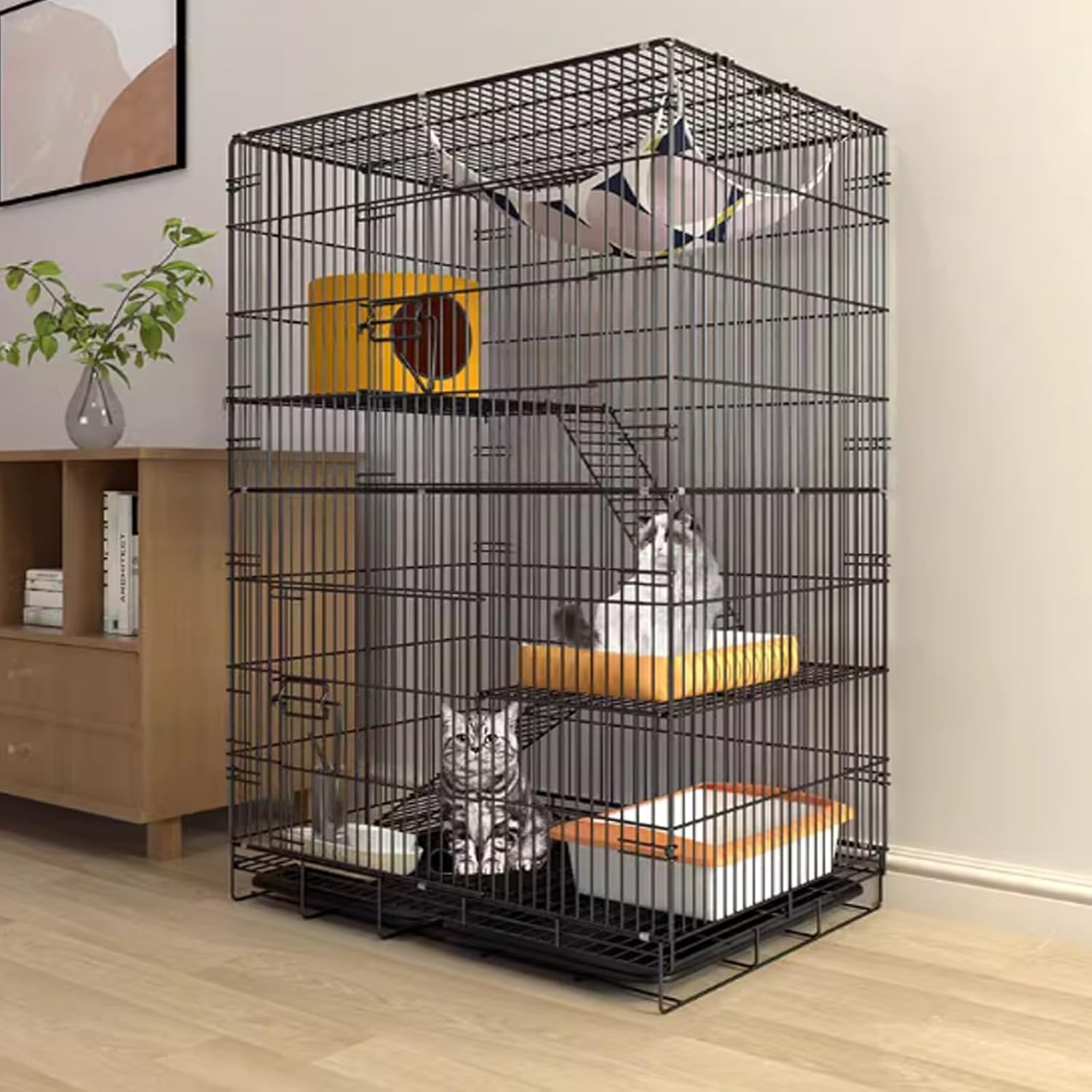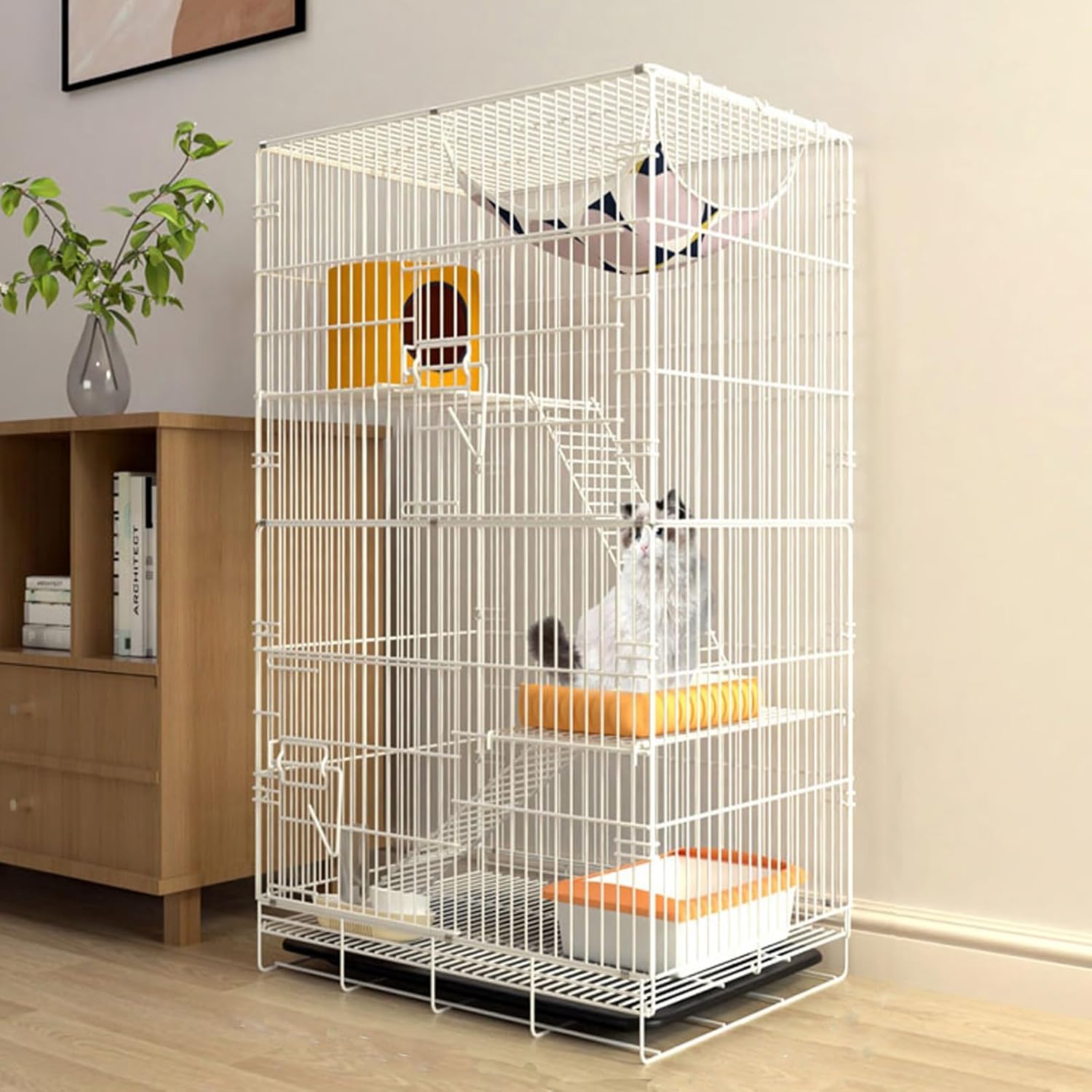 This cat cage is a must have for any cat lovers. This cage offers safe space for even the most energetic cat to run, jump and play! It promotes health and longevity, your furry friends could get physical and mental stimulation. Specifications: Name: Cat cage / Pet fence / Pet playpen / Cat crate / Cat house / Cat cage villa / Cat apartment cage/ Cat enclosure Material: Metal Colors: Black, White Size: (The size is as shown in the picture) 60*42*91cm , 68*50*105cm , 85*62*130cm Assembly Required: No Suitable for small animals like kittens or rabbits, dog Package List: Cat Cage *1 Hammock *1 Toilet Tray *1 Platform Climbing Ladder *1 Ties *1 package
