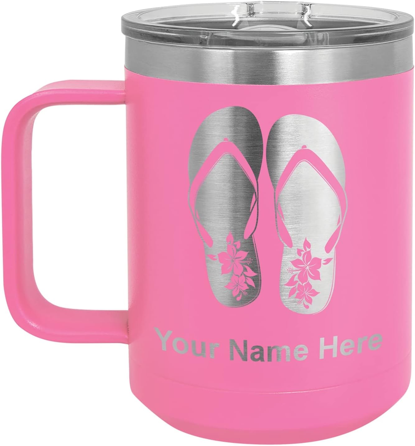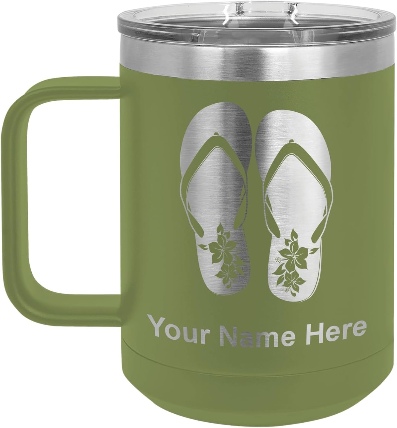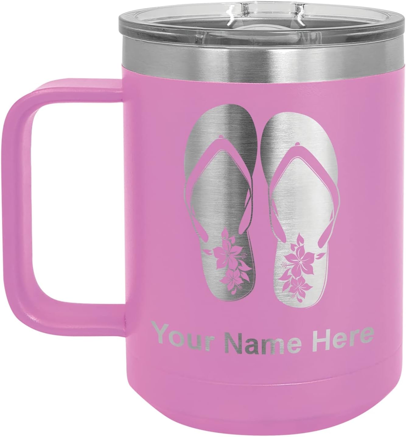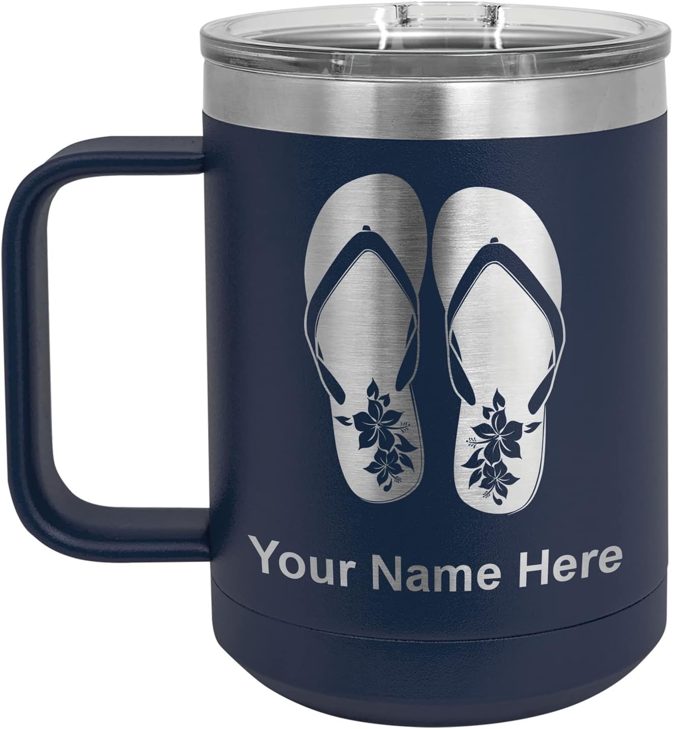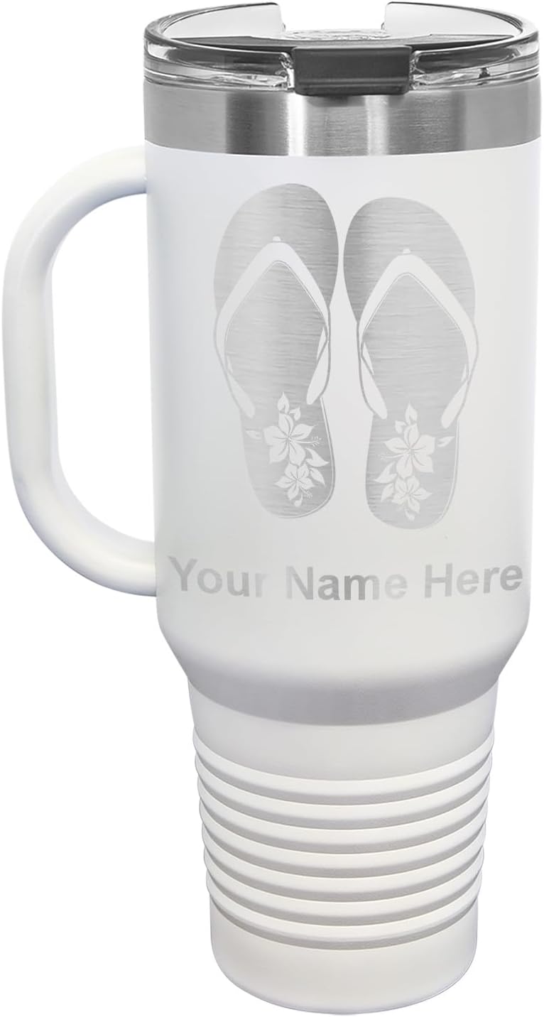 LaserGram 40 ounce Travel Mug with Handle that is laser engraved with the image that you see in the photo. Your own personalized text will be laser engraved below the image. Features double-walled stainless steel vacuum insulation with a clear lid. Click the "Customize Now" button to begin customizing your mug.