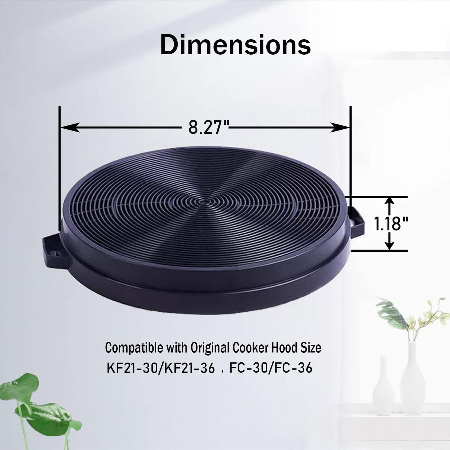 ✅MATERIAL:Made from high-quality activated carbon and high density flame-retardant non-woven fabrics.Suitable for ductless operation. ✅FUNCTION:Effectively removes oily fumes and cooking odors.Keep kitchen air fresh. ✅DIMENSIONS:Diameter 7.88 inch.Original configuration,Compatible with FC-30/36;KF21-30/36. ✅EASY-TO-INSTALL:Easy tool-free installation,Locate the motor right & align the filter,Twist & lock the filter into place. ✅SUGGESTION:Replace every 3--6 months frequently depending on use.