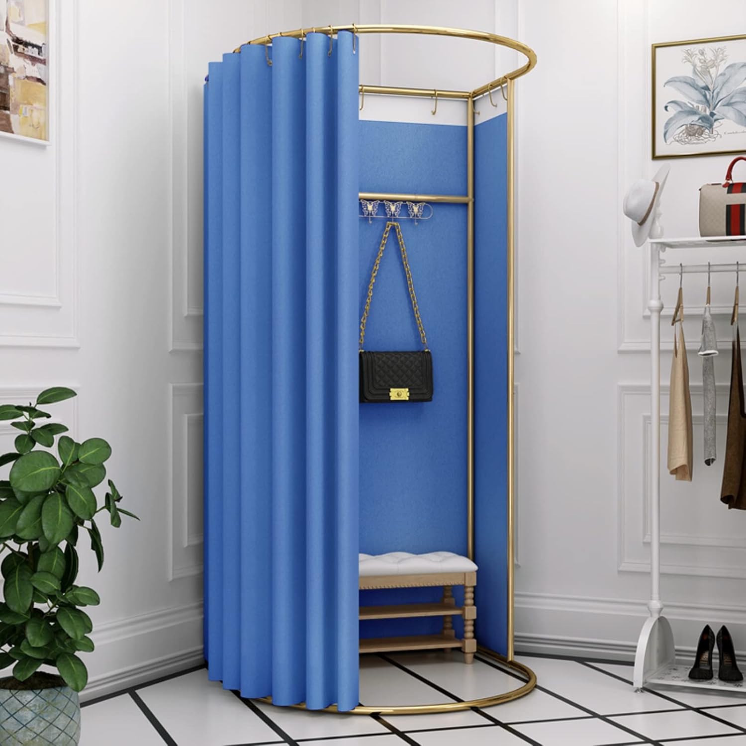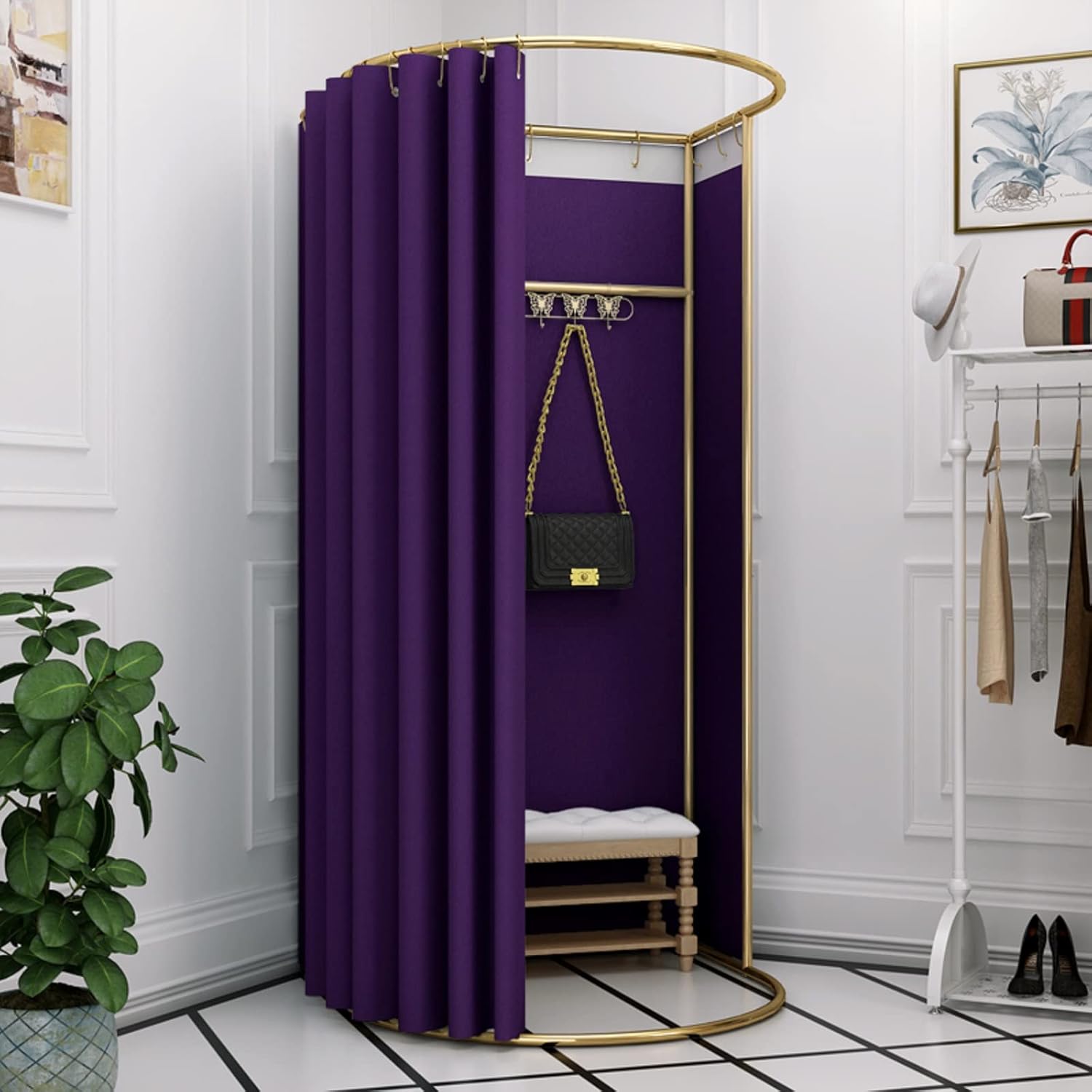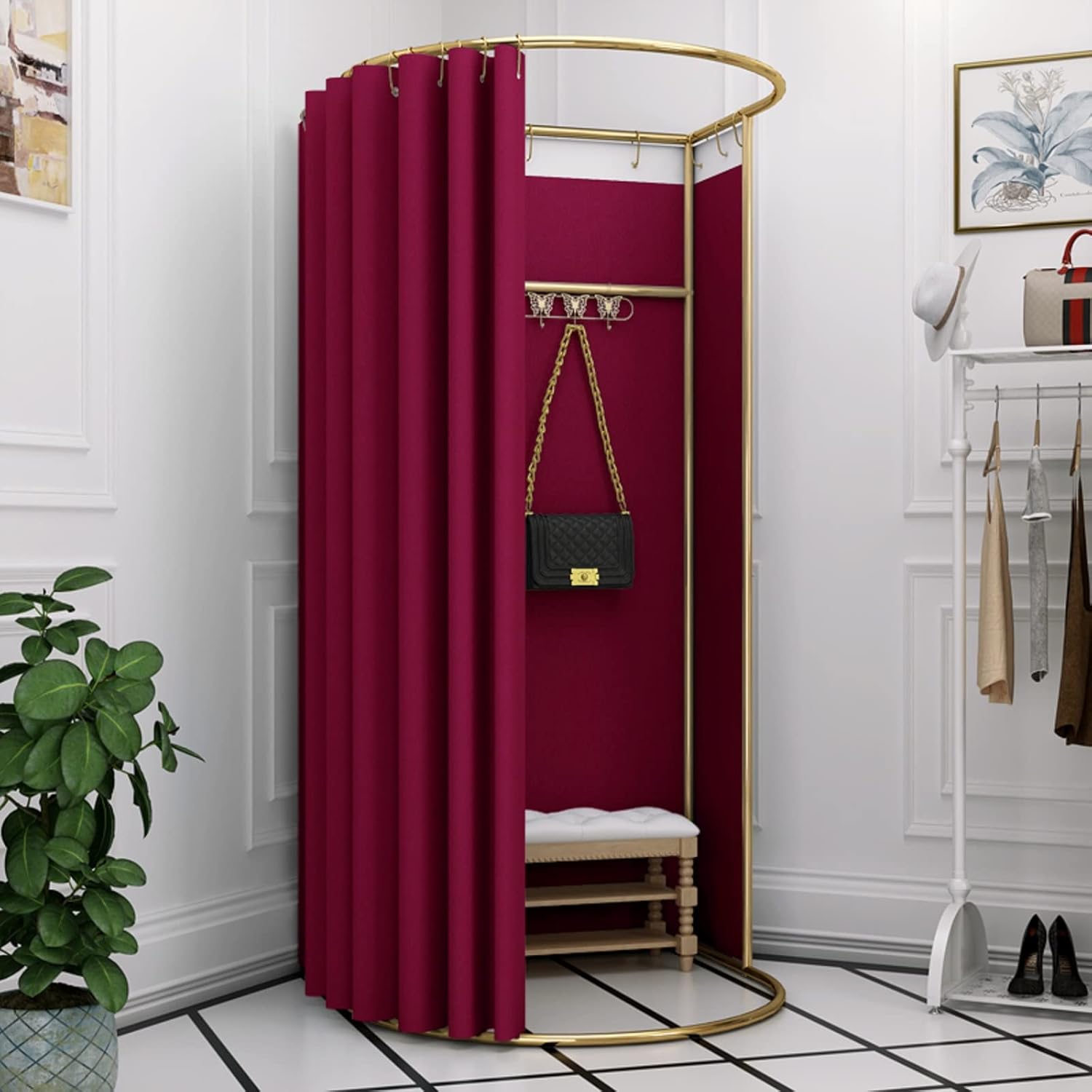 Widely applicable, this portable cloakroom enhances any room with its unique elegance and charisma, sure to delight your guests. Ideal for clothing stores, it features a sturdy plastic hook for easy operation of the cloakroom curtain. The thickened blackout cloth ensures privacy and personal space, while the independent sliding ring allows for convenient use. Made with environmentally friendly paint and robust, thicker pipes, this dressing room is durable and stable. Its oval base design fits perfectly in corners to save space without compromising load-bearing stability. The removable support rail is crafted from thicker pipes for enhanced durability, ensuring a stable, non-shaking structure; the hose is detachable and easy to install. Name: Changing Room Quantity: 1 Material: Metal frame and shading cloth Style: Stylish and simple Requires assembly: Yes Size: 100x95x200cm (40x38x80in) Features: Portable and mobile, occupies minimal space. Scope of application: This locker is suitable for use in clothing stores, shopping malls, offices, specialty stores, bedrooms, dormitories, outdoor sheds, walkways, and more. Package includes: Blackout curtain x 1, Metal frame x 1 (gold). Note: This product includes only the walk-in cloakroom; other decorations are not included. The metal frame is packaged in sections for easy assembly, ensuring no wear during setup.