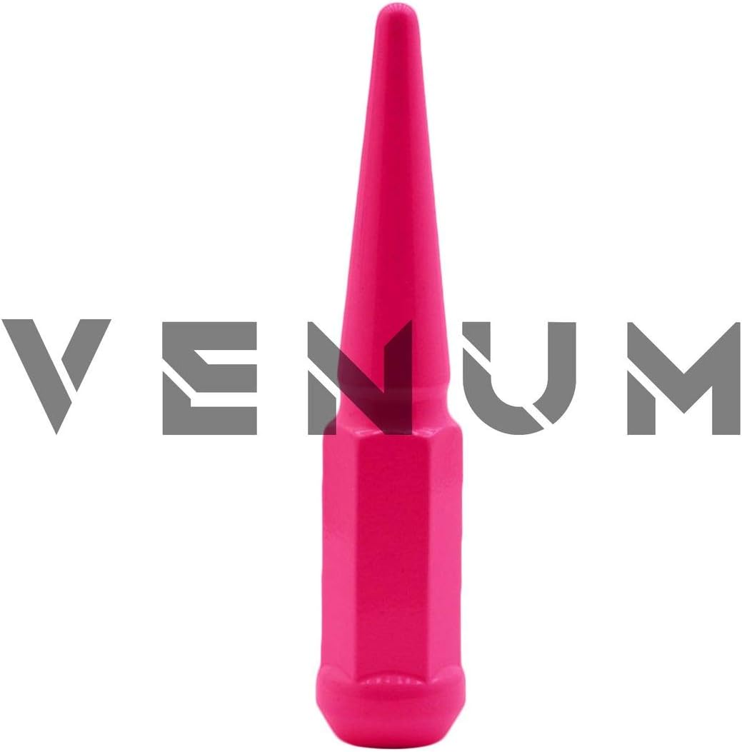 [ PRODUCT DESCRIPTION ] New 24 Pc Set of Hot Pink "SOLID SPIKE" Steel Lug Nuts. Fits all 14x1.5 vehicles with aftermarket wheels & conical seating. These lug nuts are not cheap ordinary lug nuts. Our lug nuts are powdercoated and made in house. We can customize any lug nut to any color. Spike Lug nuts are THE HOTTEST aftermarket lug nuts in the market. Made out of 10.9 Grade Steel, 1 Piece construction. These lug nuts require a special socket to install/remove them. At the same time it adds security to your wheels. Special key is included. [ COMPATIBLE WITH ] All Years Chevrolet Avalanche 2015-2020 Mustang 1988-1998 C-1500 Pickup 1997-2002 Express Van 1500 1995-2020 Suburban C 1500 1995-1999 Tahoe 2WD 2015-2019 Durango 2009-2020 Challenger 2007-2019 Charger 1992-1999 Yukon ( 5 Lug) 2011-2020 Grand Cherokee 2012-2018 RAM 1500 1999-2020 Range Rover 1998-2020 Land Cruiser 2008-2020 Sequoia 2007-2020 Tundra & More [ IMPORTANT NOTES ] - Must have Aftermarket wheels - Will not work with stock wheels unless it has a conical seating [ INSTALLATION NOTES ] - Installation should be tightened by hand. - Make sure to get at least 6-8 FULL TURNS of the lug nuts when tightening. - Be sure to hadn torque the lug nuts to you'r vehicles specifications - Check and re-torque all lug nuts after 25-50 miles of driving - (310) 763-0028