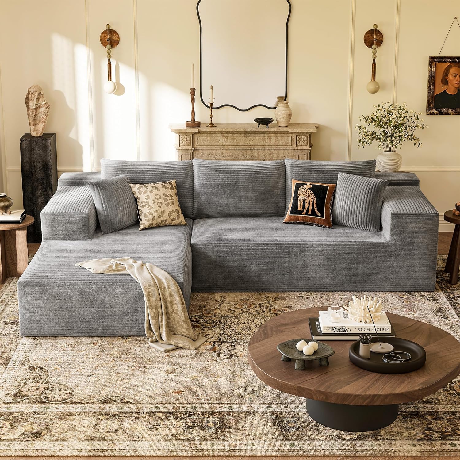 Description: Our boneless couch with wide and deep seat is perfect for living room, apartment. 2 L-shaped chaise consist of a sectional sofa. Versatile and flexible. High-density sponge offers both softness and firmness. No assembly required is easy setup Tips: 1. Due to the sponge rebound, when just unpacked, the size may deviate from the picture size, after 72 hours of resting, the product size will be restored to the size of the picture 2. Pat the L-shaped couch, cushions and pillows, and let it absorb air 3. 2 box delivered, please wait patiently, you will get it soon Specification: - Color: Gray/Cream/Pearl Gray/Pearl Cream - Material: Corduroy/Chenille, High-density Sponge - Overall Dimension: 108” W x 67” D x 28” H - Seat Dimension: 57.4” W x 30.3” D x 17” H