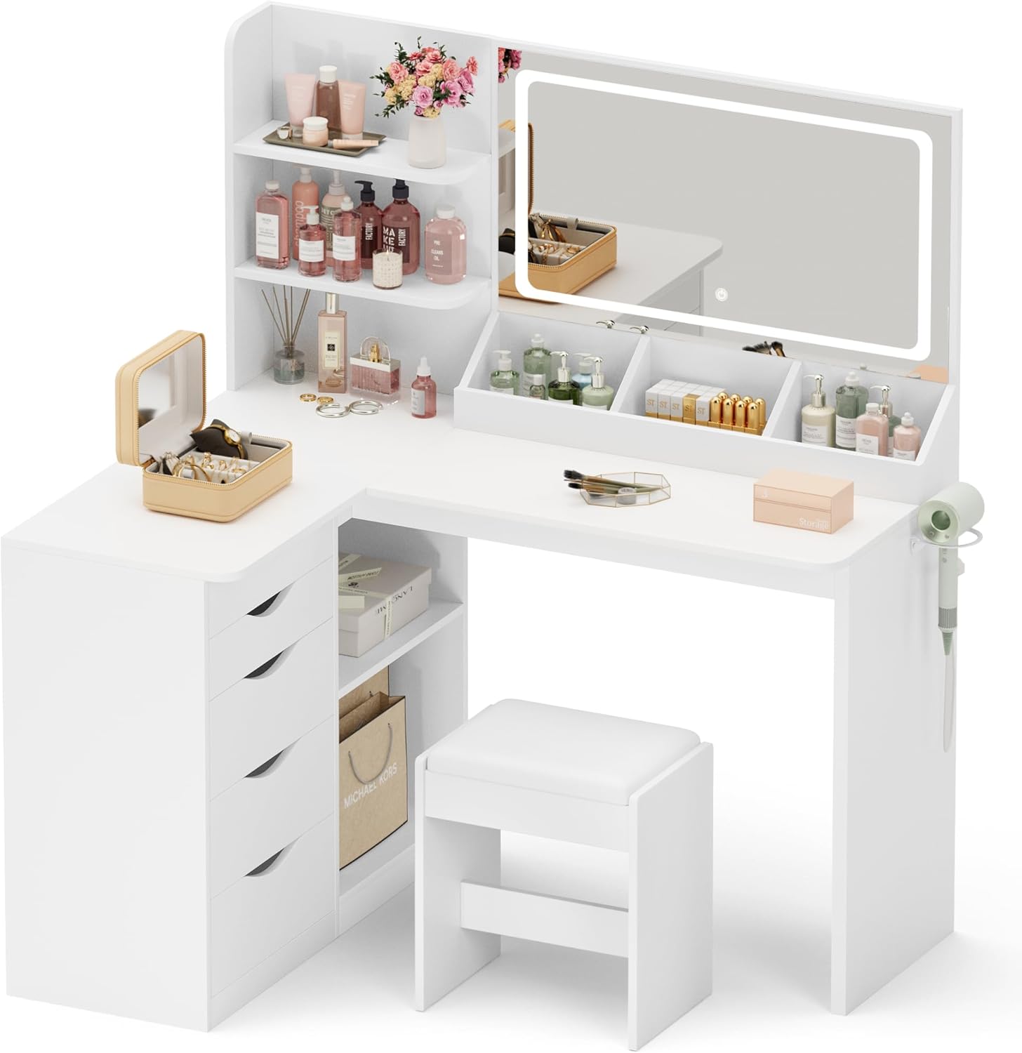 | Item Type Name | L Shape Vanity, LED Lighted Mirror, with Power Outlet and 3 Storage Shelves, Makeup Table with 5 Drawers, 3 Color Modes, for Bedroom |
